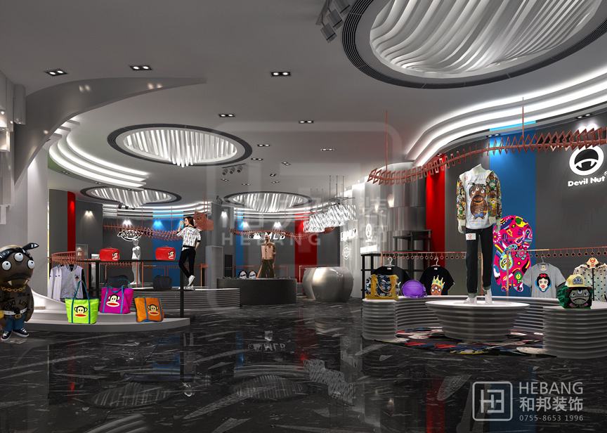 | 設(shè)計(jì)說明 | 極具現(xiàn)代風(fēng)格,豐富的色彩運(yùn)用以及富有童趣的設(shè)計(jì)元素使整個(gè)賣場氛圍輕松、明快。創(chuàng)意十足的天花設(shè)計(jì)以及吸引眼球的墻面裝飾更能吸引消費(fèi)者眼球。 | ||||