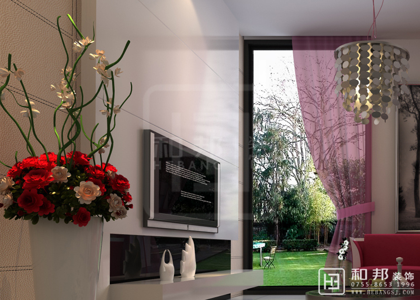 紅色系的沙發、電視柜旁邊搭配一株紅粉搭配的植物,給人一種協調的美感,傳遞著舒適的氣息,明亮的光線從寬大的窗戶照進,讓客廳空間顯得寬敞大氣。