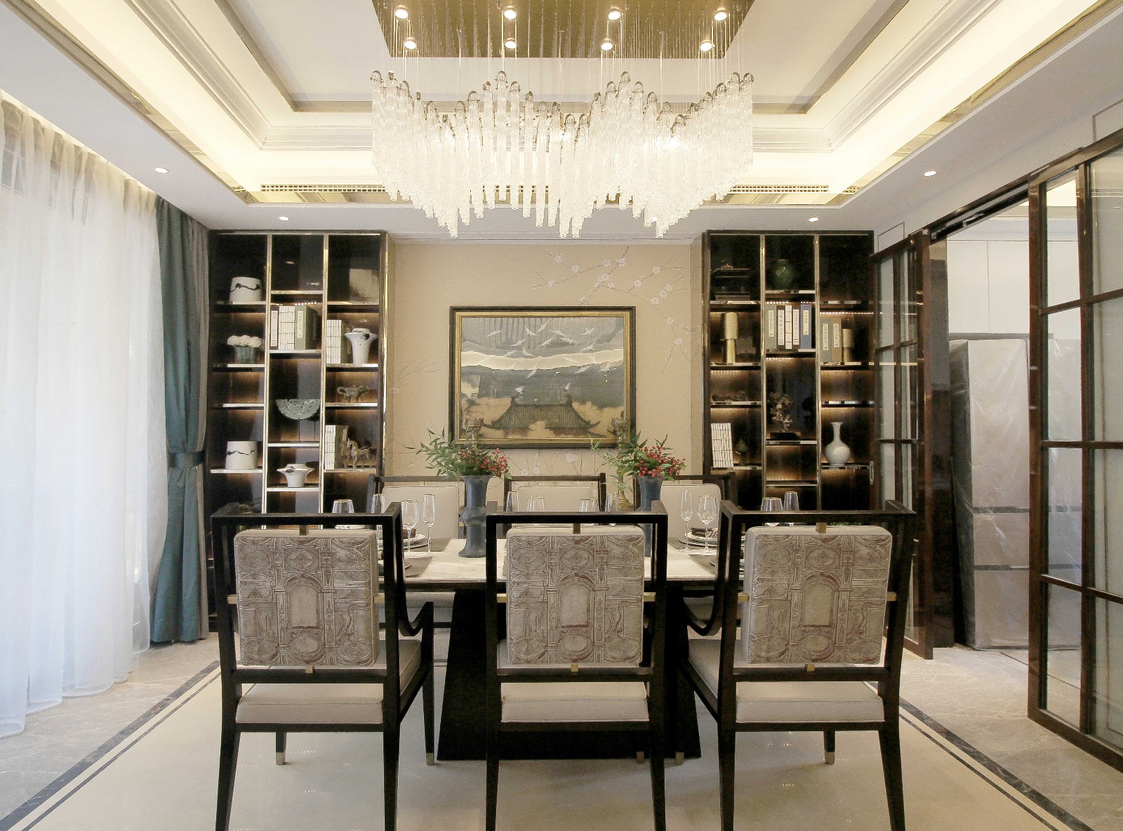 一層空間,讓我們進(jìn)入到了“隔而不離”的敞朗的客餐廳區(qū)域。簡(jiǎn)潔的米色作底,夾雜著立體而溫潤(rùn)的木色,梳理出了柔和而婉約的空間氣質(zhì)。餐廳一側(cè),我們通過(guò)加擴(kuò)原空間陽(yáng)臺(tái)的位置,最大限度地納入室外的自然之景,與客廳區(qū)一并形成了雙面采光觀景的空間效果。光在空間中遷移流轉(zhuǎn),那些與人聯(lián)系密切的物品也逐漸顯露出各自的色彩、層次,和肌理,人在其中生活,只覺(jué)是生活在自然與柔軟的日常里。