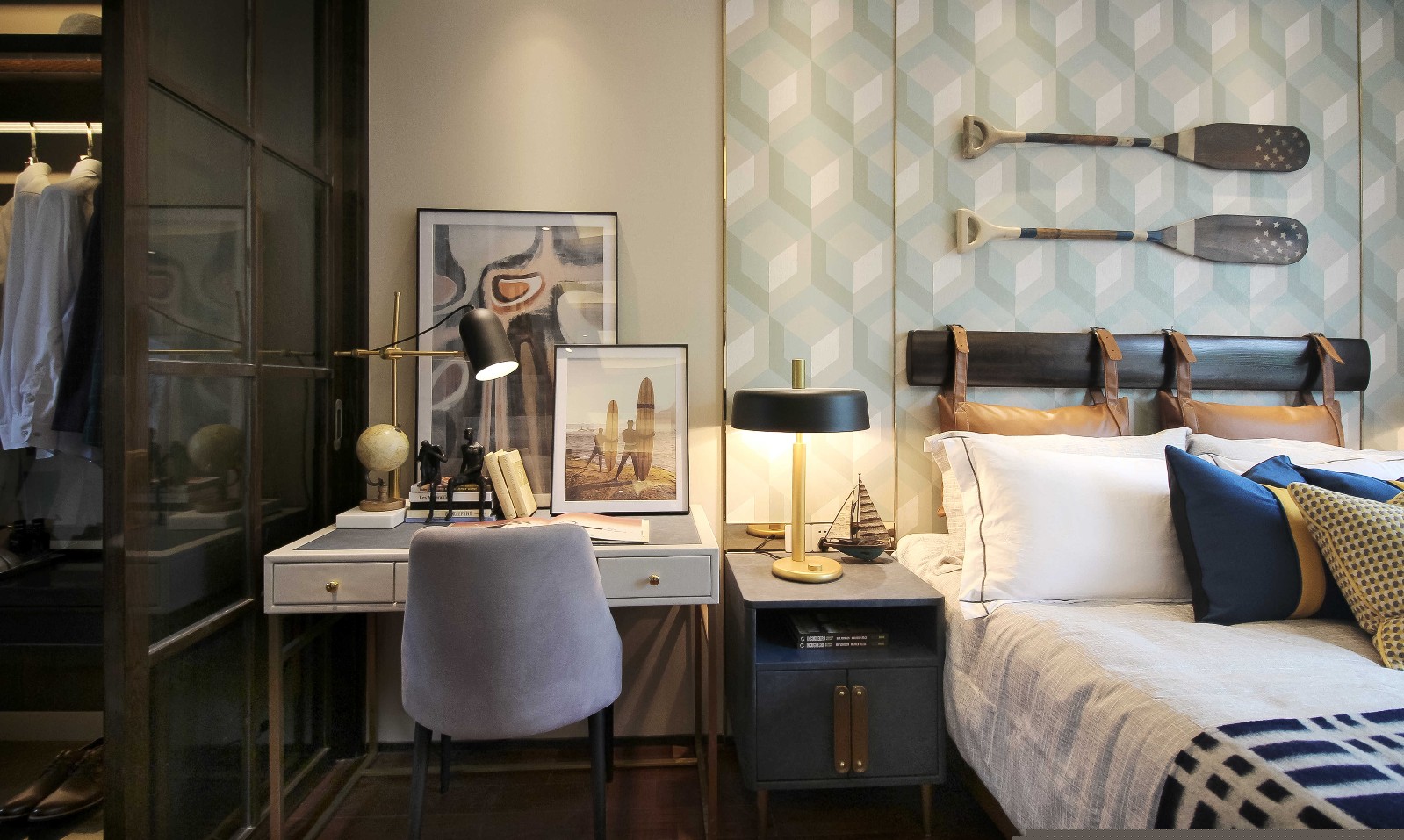 男孩房以藍(lán)色為空間主色調(diào),我們以藍(lán)色與白色的對(duì)比來(lái)延續(xù)空間的活力。書桌上靜靜安放的書籍,訴說(shuō)著主人愛(ài)好與故事。