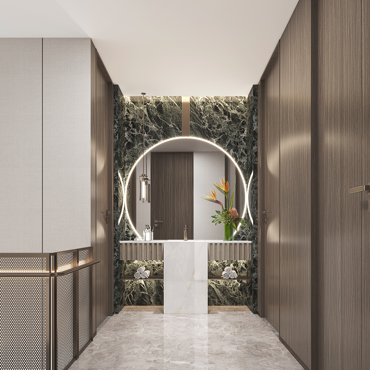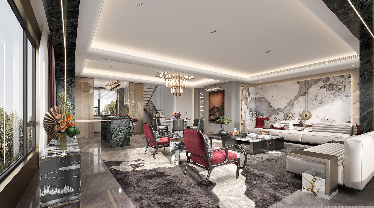 一層以“見山”為題,強(qiáng)調(diào)一種寬廣的、壯闊的詩意生活。基于建筑條件中極具優(yōu)勢的景觀資源條件,整體空間以“向外打開”的通透意境處理界面與層次關(guān)系,渾厚而瑩潤的古銅色調(diào)以匹配大開大合的空間尺度而營造出居室特有的生活氛圍。開門見山,獨(dú)享豁達(dá)人生。
