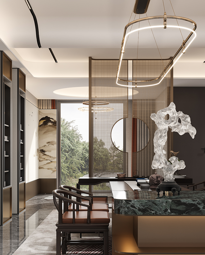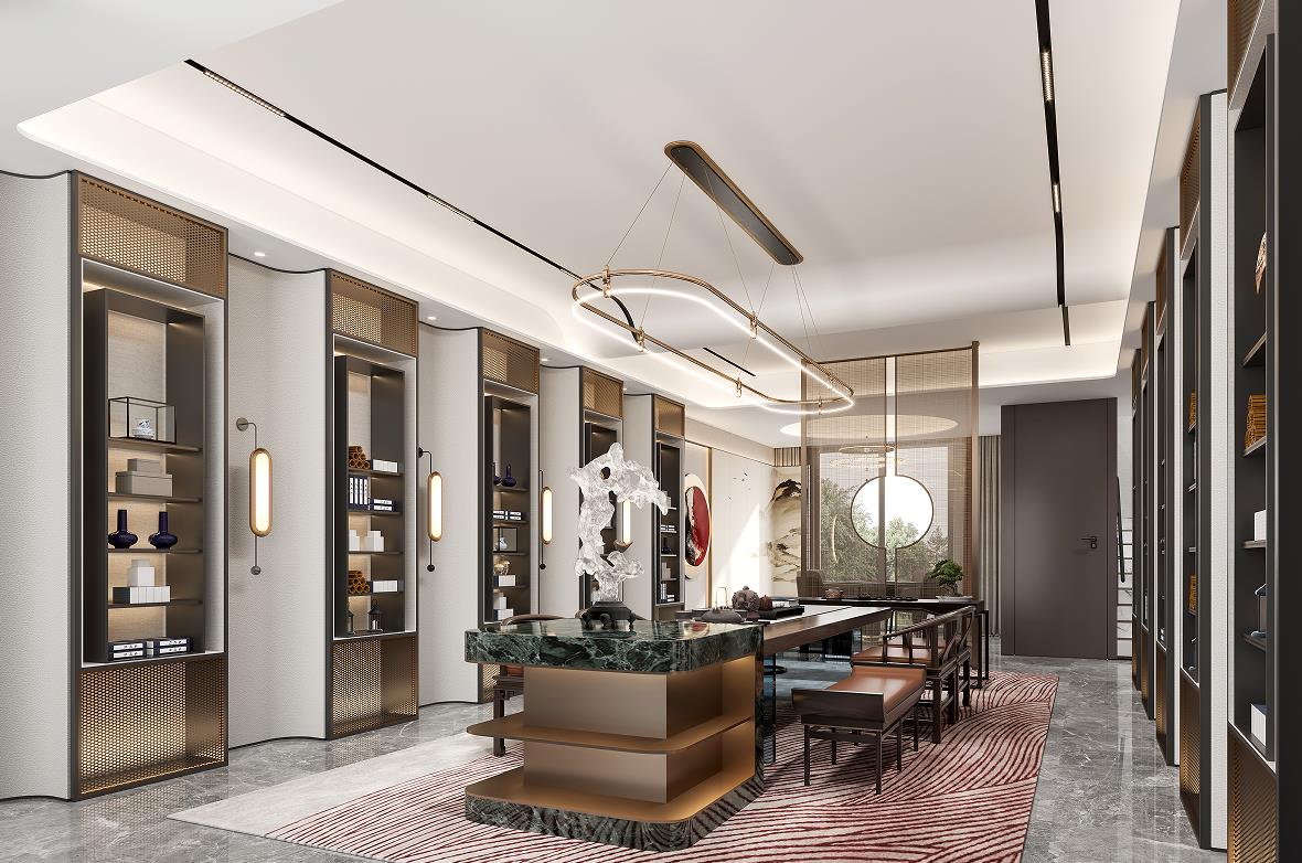 負(fù)一層會(huì)客廳打造為男主人的社交空間,精致的茶臺(tái),私享的收藏展閱,是屬于和朋友閑談、聊天的專屬場所。