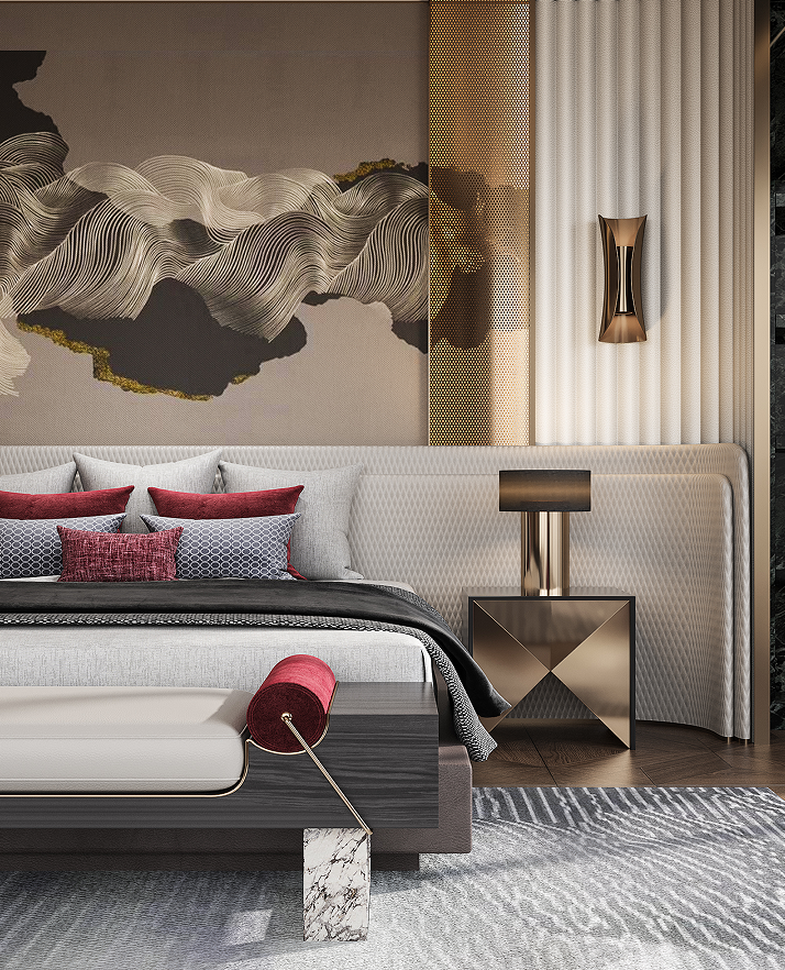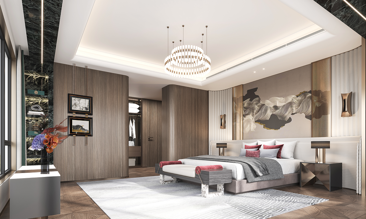 二層主臥空間環(huán)景式體驗(yàn)主臥套間形式,擁有超大景觀視野,并配備了獨(dú)立衣帽間、衛(wèi)浴室。軟裝將裝飾的重點(diǎn)放在了色彩的呼應(yīng)關(guān)系、與面料觸感與肌理給予人的真實(shí)體驗(yàn)之上,隨處可見的進(jìn)口家具產(chǎn)品將主人的品味于隨意處散發(fā),呈現(xiàn)了一處格調(diào)高雅的休憩空間。